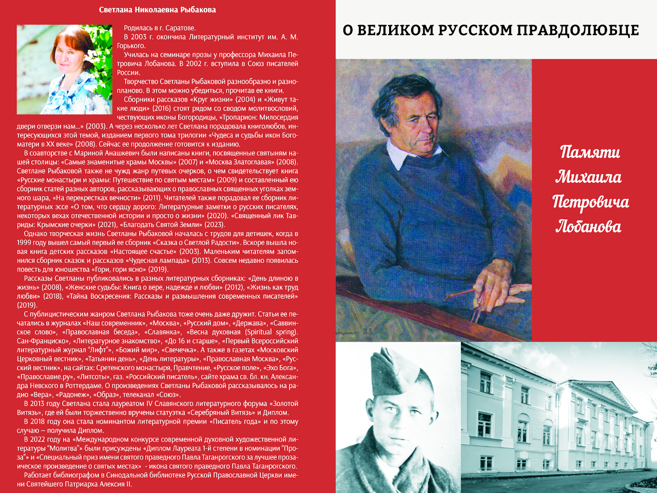 ![]() Светлана Рыбакова. О великом русском правдолюбце. Книга памяти Михаила Петровича Лобанова и очерки о русских литераторах, Москва, Издательство «Духовная Нива», 2025 Читать книгу в формате .pdf В ноябре 2025 года писателю, литературному критику, профессору кафедры литературного мастерства Литературного института имени А. М. Горького исполнилось бы сто лет. А ведь бывают, что и доживают… Михаил Петрович ушел от нас в 2016 году, в возрасте 91 года. Жизнь он прожил долгую и достойную, очень созвучную названию одной из его книг «В сражении и любви». Так уж повелось, что отношения студентов Литературного института с их мастером часто становятся дружескими, выходя за рамки обучения литературному мастерству, передачи профессионального опыта. Вот и для Светланы Рыбаковой, выпускницы семинара Лобанова, на сегодняшний день уже реализовавшемся авторе, Михаил Петрович стал таким учителем-другом, старшим товарищем, с которым хочется говорить, делиться своими пусть малыми, но открытиями в переосмыслении литературы и исторических процессов, рассказывать о людях, которые удивили и вдохновили. А как продолжить этот диалог, ведь человека уже с нами нет… И Светлана написала книгу, посвященную своему мастеру. Назвала ее «О великом русском правдолюбце». Кстати, книга недавно получила золотой диплом на Международном Славянском литературно форуме «Золотой витязь». В начале своего повествования Светлана перемещается в детство Михаила Петровича и вместе с маленьким Мишей Лобановым смотрит сквозь щели драной крыши сеновала на одинокие звезды, уносясь мыслью в неизведанные, манящие и одновременно ужасающие пространства. Потом разделяет с юным Михаилом его первые впечатления от поэзии Есенина и счастье получение первого гонорара за публикацию в районной газете. Война, ранение, постоянная необходимость совершать нравственный выбор, смена времен и экономических формаций, стремление при любой власти оставаться честным человеком и честным автором, насколько это вообще возможно, приход к вере – все эти перипетии человеческой и писательской судьбы своего наставника Светлана постаралась пропустить через свои разум и сердце. Удивительным и трогательным показался мне рассказ Рыбаковой о посещении Дома культуры имени Лобанова на малой родине писателя. 12 декабря 2019 года его имя было присвоено Екшурскому сельскому Дому культуры Клепиковского района Рязанской области. Читая о ее впечатлениях об этом мероприятии, я буквально расплылась в улыбке на одном моменте: «Наблюдая приходивших зрителей-сельчан, заметила, что мужчины немножко сутулятся, несколько тяжело и твердо ступают по полу, смотрят, чуть склонив голову в сторону, что живо напомнило Михаила Петровича. Некоторые из них и своим обликом: немного продолговатым овалом лица и своеобразной посадкой глаз, с чуть припухшими веками, были и внешне похожи на нашего мастера. Для меня, безвылазно городского человека, произошло маленькое открытие, оказывается, люди, поколениями живущие в одном краю, и внешне схожи друг с другом». Верю, что эти теплые, по-девичьи непосредственные строки каким-то образом дошли до Михаила Петровича и он тоже улыбнулся нам с Небес. Помимо путешествия по судьбе своего учителя, книга Светланы Рыбаковой содержит очерки о писателях и событиях, что произвели на нее особое впечатле