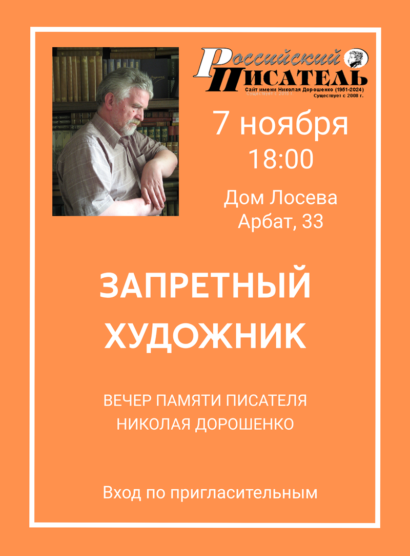 ВЕЧЕР ПАМЯТИ Н.И. ДОРОШЕНКО (1951-2024)7 ноября 2025 года в 18 часов 00 минут в концертном зале Дома А.Ф. Лосева (г. Москва, ул. Арбат, дом 33, 3 этаж) состоится вечер памяти известного писателя и общественного деятеля Николая Ивановича Дорошенко "Запретный художник". Вечер ведёт Иван Ерпылёв. Предполагаемая продолжительность вечера 1 час 30 минут. В программе - выступления известных писателей, а также друзей и соратников Н.И. Дорошенко. Для внесения в список гостей и получения электронного пригласительного просим сообщить о желании посетить мероприятие с указанием фамилии, имени, отчества Ивану Ерпылёву по электронной почте ivanerpylev@yandex.ru. По всем иным вопросам также можно обращаться по указанному электронному адресу. Следует иметь в виду, что по правилам площадки допуск зрителей осуществляется не ранее, чем за 30 минут до начала мероприятия.