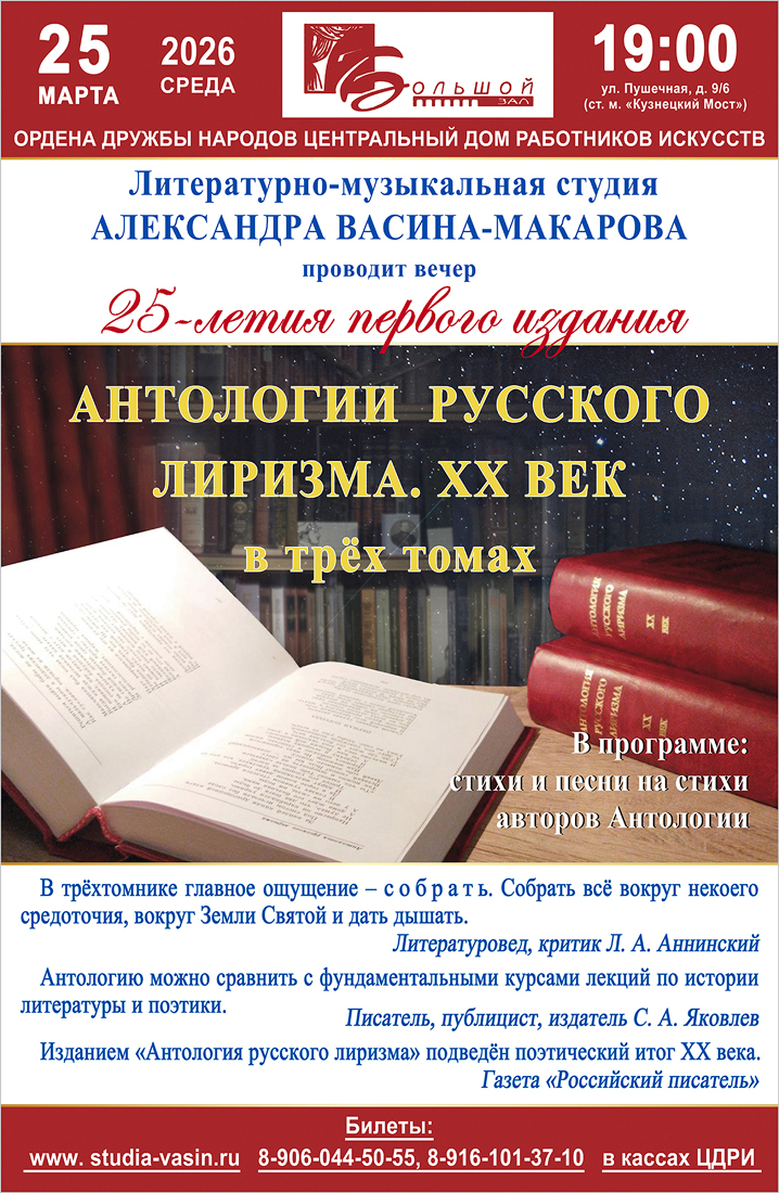ПРИГЛАШАЕМ! Среда, 25 марта 2026 года, 19 часов Центральный Дом работников искусств 25-летие первого издания Вечер проводит Литературно-музыкальная студия А. Васина-Макарова Билеты на сайте Студии studia-vasin.ru/ *** В трёхтомнике Антологии более 700 авторов, представляющих в совокупности принципиальную структуру культурного пространства России. Неповторимая особенность нашей страны в том, что в создании этого культурного пространства участвуют творцы необыкновенно широкого спектра: от общепризнанных классиков до совершенно новых имён; от представителя царской династии до нищего; от профессионального литератора до пастуха; от эмигрантов до деятелей национальных культур бывших союзных республик; от традиционалистов до так называемых авангардистов... Не «историко-литературные периоды», не «направления», «школы», «течения» или «обоймы» определили выбор участников Антологии, но общее главное свойство стихотворений, фрагментов прозы, дневников, заметок, вошедших в Антологию, — обострённое чувство жизни, проистекающее из природного лиризма русских людей. На вечере можно приобрести 3-е (дополненное и исправленное) издание "Антологии русского лиризма. ХХ век" (2019) В трёхтомнике Антологии более 700 авторов, представляющих в совокупности принципиальную структуру культурного пространства России. Неповторимая особенность нашей страны в том, что в создании этого культурного пространства участвуют творцы необыкновенно широкого спектра: от общепризнанных классиков до совершенно новых имён; от представителя царской династии до нищего; от профессионального литератора до пастуха; от эмигрантов до деятелей национальных культур бывших союзных республик; от традиционалистов до так называемых авангардистов... Не «историко-литературные периоды», не «направления», «школы», «течения» или «обоймы» определили выбор участников Антологии, но общее главное свойство стихотворений, фрагментов прозы, дневников, заметок, вошедших в Антологию, — обострённое чувство жизни, проистекающее из природного лиризма русских людей. На вечере вы сможете приобрести 3-е (исправленное и дополненное) издание «Антологии русского лиризма. ХХ век» Об «Антологии русского лиризма. ХХ век» говорят: Историк, писатель, литературный критик Писатель, литературный критик Профессор Литературного института, «Когда весна придёт, не знаю…» (ст. А. Фатьянова, муз. Б. Мокроусова) |
