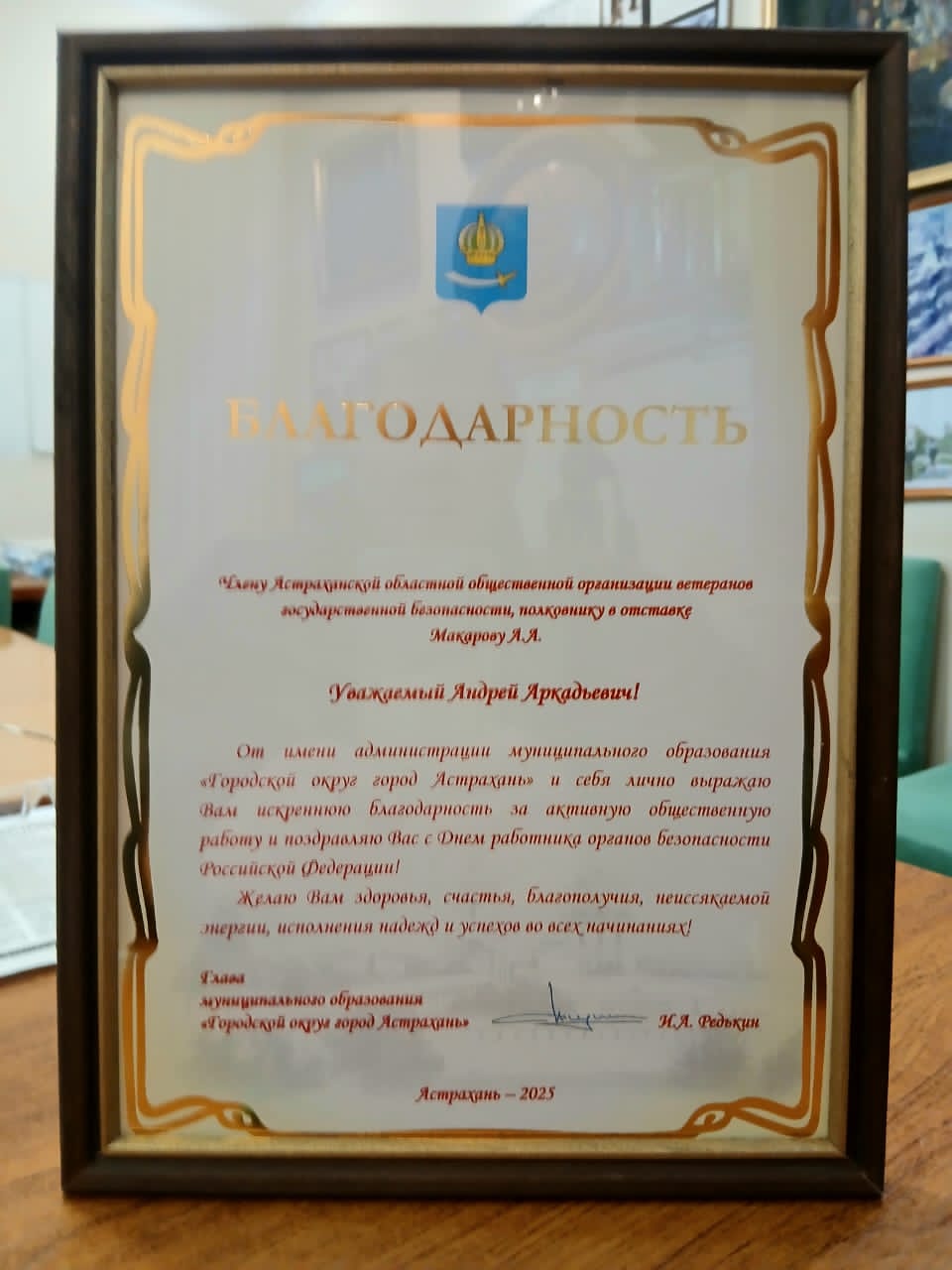 Председателю Клуба любителей детективов, члену Союза писателей России, члену Астраханской областной общественной организации ветеранов органов государственной безопасности, подполковнику Макарову Андрею Аркадьевичу вручено Благодарственное письмо за подписью главы муниципального образования "Городской округ город Астрахань" И.А. Редькина.