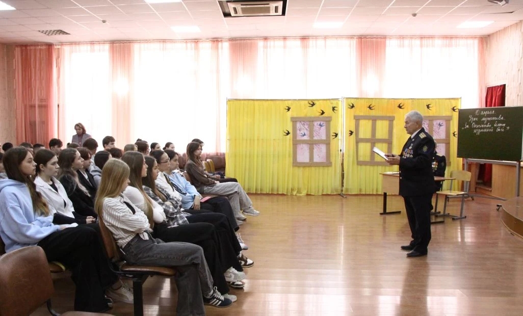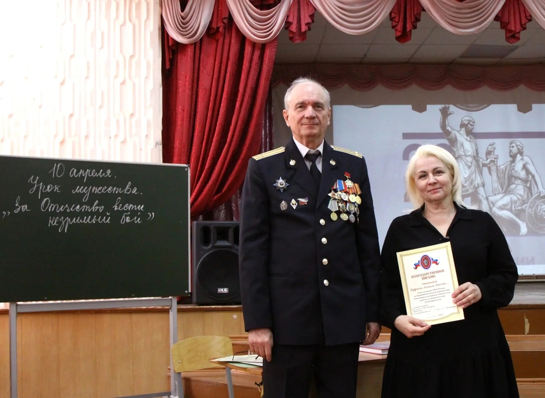 В рамках Урока мужества состоялась интересная и познавательная встреча учащихся старших классов средней школы №33 имени известной астраханской поэтессы Нинель Мордовиной с ветеранами органов безопасности и литераторами. Были приглашены члены Совета ветеранов Управления ФСБ России по Астраханской области подполковник Ю.Ф. Космачёв и подполковник, член Союза писателей России А.А. Макаров. Тема Урока мужества - «За Отечество вести незримый бой».
