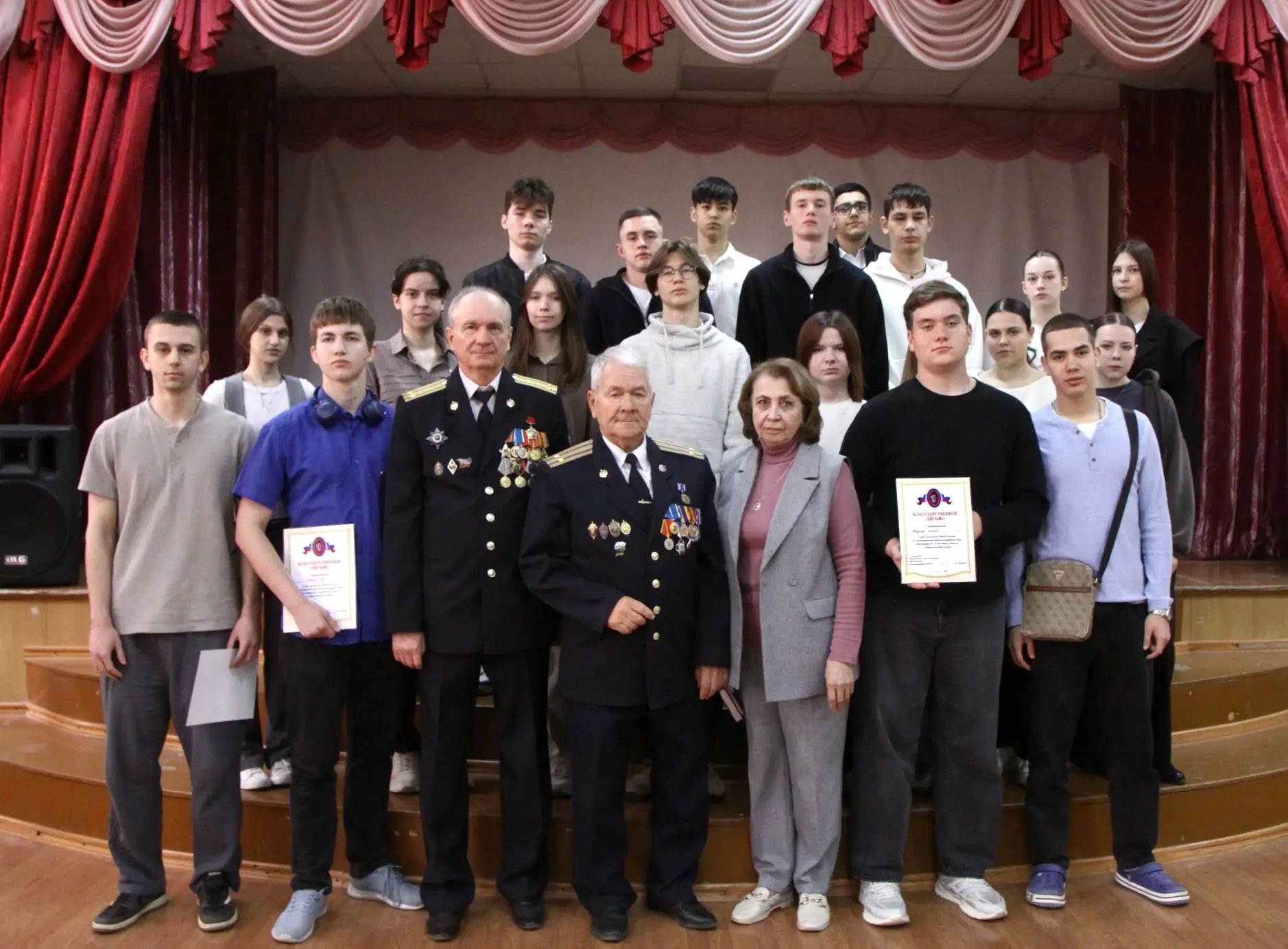 В заключение встречи гости подарили книги: повесть "От Астрахани до Берлина" и сборник "За Отечество вести незримый бой", в который включены повести, рассказы и очерки астраханских писателей и журналистов о чекистах - участниках Великой Отечественной войны. Книги изданы по инициативе и при непосредственном участии Совета ветеранов. Преподавателям и учащимся, которые ведут активную работу по патриотическому воспитанию молодёжи, вручены Благодарственные письма от Совета ветеранов.