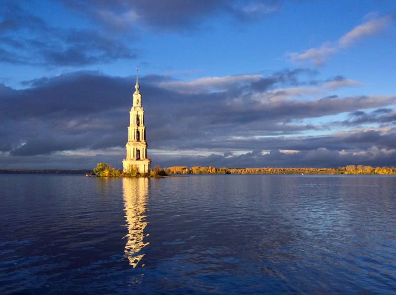 В 1939-1940 годах в зону затопления в связи со строительством Угличской ГЭС попала значительная часть города Калязина. Город Калязин возник в ХV веке как слобода Троицкого Калязинского Макарьева монастыря, основанного в 1434 году. С 1775 года Калязин получил статус города в результате объединения Калязинской монастырской и Никольской слободы, с тех пор стал центром уезда. В 1939-1940 годах перед затоплением город был частично разобран. Из 1300 домов города в зону затопления попало 530 домов, из воды осталась видна колокольня затопленного Никольского собора Троицкого Калязинского Макарьева монастыря.