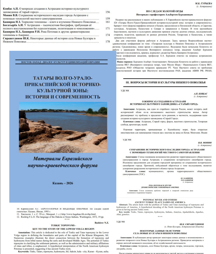 Краеведение: диалог культур и цивилизацийРаботы астраханских писателей, историков, краеведов-исследователей включены в научно-краеведческий сборник, большая презентация которого состоялась во Всероссийском круглом столе-конференции в Казани. Называется сборник "ТАТАРЫ ВОЛГО-УРАЛО-ПРИКАСПИЙСКОЙ ИСТОРИКО-КУЛЬТУРНОЙ ЗОНЫ: ИСТОРИЯ И СОВРЕМЕННОСТЬ. Материалы Евразийского научно-краеведческого форума". Серия «Восток-Запад: диалог культур и цивилизаций Евразии». Выпуск 33. Под редакцией А.А. Бурханова. 528 страниц. Среди авторов: М.Б. Гурьева "По следам Золотой Орды" - беседа с академиком, профессором А.А. Бурхановым; А.П. Ковбас "О вопросах создания в Астрахани историко-культурного заповедника "Старый город"; В.В. Монин "Сохранение исторического наследия города Астрахани с помощью технологий местного самоуправления"; Н.З. Баширов "Тюркские топонимы - ключ к изучению Нижнего Поволжья"; Баширов Н.З. и Баширов Р.Н. "Река Потомак и другие древнетюркские (прототюркские) топонимы в Америке"; А.И. Богатырёв "У Астрахани - тысячелетняя биография, требующая её полного восстановления без идеологизации, политизации и "омоложения" и другие. Краевед-исследователь Наиль Баширов вошёл в редакционный совет сборника. Организаторы Всероссийского круглого стола-конференции, в рамках которого прошла презентация: Всемирный конгресс татар; Комитет по работе с татарскими краеведами исполкома ВКТ; региональная общественная организация "Общество татарских краеведов" Республики Татарстан; Координационный совет по развитию татарского краеведения в Республике Татарстан, регионах Российской Федерации и сопредельных странах; Международная гуманитарная академия "Европа-Азия", Институт культуры мира (Юнеско), Институт краеведения; Российская Академия естественных наук АНО "Татарский центр содействия развитию академической науки"; Академия наук Республики Татарстан, Золотоордынская комплексная историко-археологическая экспедиция. Поводов для такого масштабного мероприятия было много, в том числе: Год единства народов России; Год воинской и трудовой доблести в Республике Татарстан; 140-летие классика татарской литературы Габдуллы Тукая (1886-1913 гг.); 120-летие Героя Советского Союза, лауреата Ленинской премии Мусы Джалиля (1906-1944 гг.) и т.д. Отметим, что Габдулла Тукай и Муса Джалиль были в Астрахани продолжительное время. Участниками и приглашёнными гостями Всероссийского круглого стола-конференции стали учёные, краеведы, музейные работники, журналисты, писатели и общественные деятели, представители органов власти и СМИ, члены Советов и активисты краеведческих структур и организаций городов и районов Республики Татарстан, сопредельных регионов исторически компактного проживания татар в Российской Федерации. Марина ГУРЬЕВА |